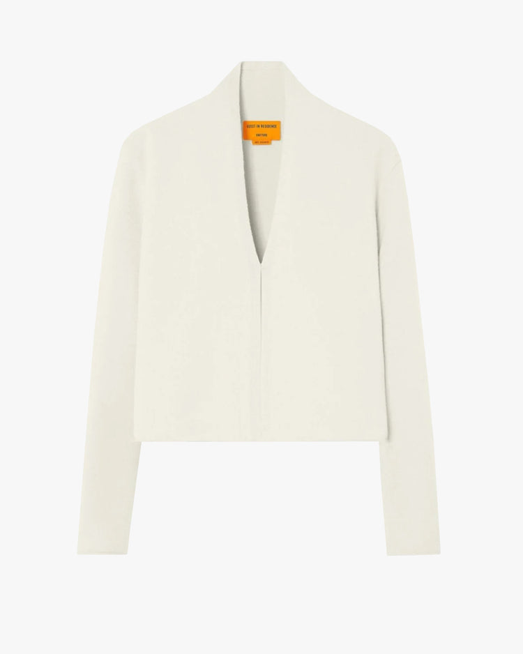 Slim fit cardigan, knitted from a lightweight 100% cashmere. Featuring an open front, hook and eye front closure, shawl collar stand, cropped length, jersey roll at hem and sleeve cuff, and signature Guest In Residence branding at centre back.