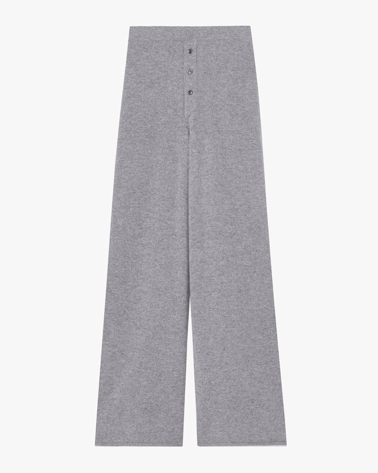 Relaxed fit trouser, cut from 100% cashmere. Low rise, featuring a straight leg, elasticated waistband, and front placket with faux three button closure.