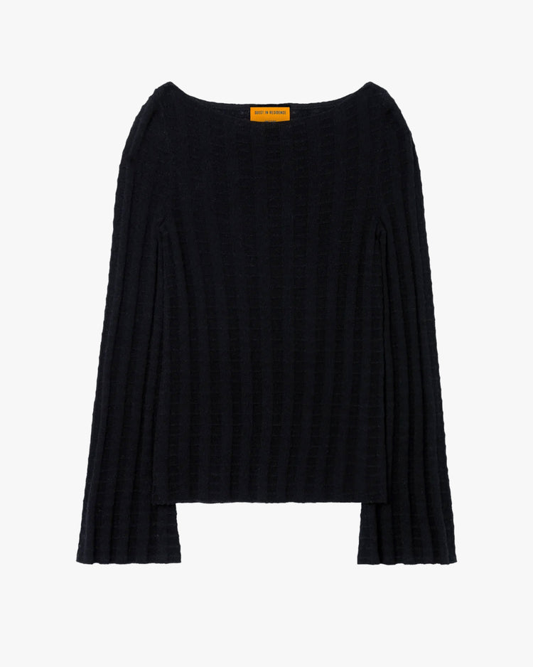 Slim fit top, knitted from 100% cashmere. Featuring a boat neckline, long, flared sleeves, all-over rib knit detailing, and self edge finish at cuffs and hem.