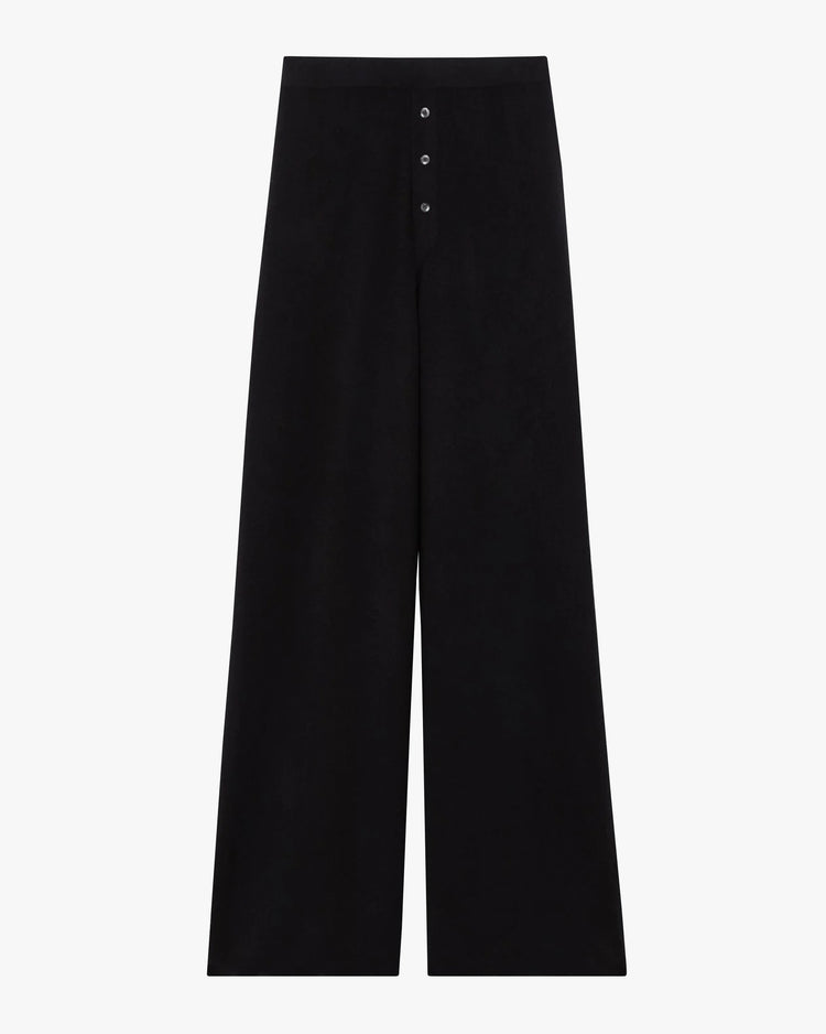 Relaxed fit trouser, cut from 100% cashmere. Low rise, featuring a straight leg, elasticated waistband, and front placket with faux three button closure.