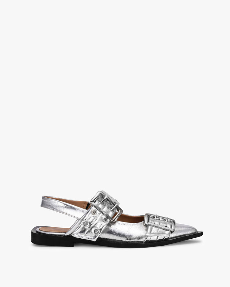 An iconic Ganni style - Feminine Buckle Ballerinas, crafted from a recycled polyester faux leather. Featuring a pointed toe, squared block heel, sling-back strap, straps across front, two large metal buckles with eyelet details and an engraved GANNI logo.