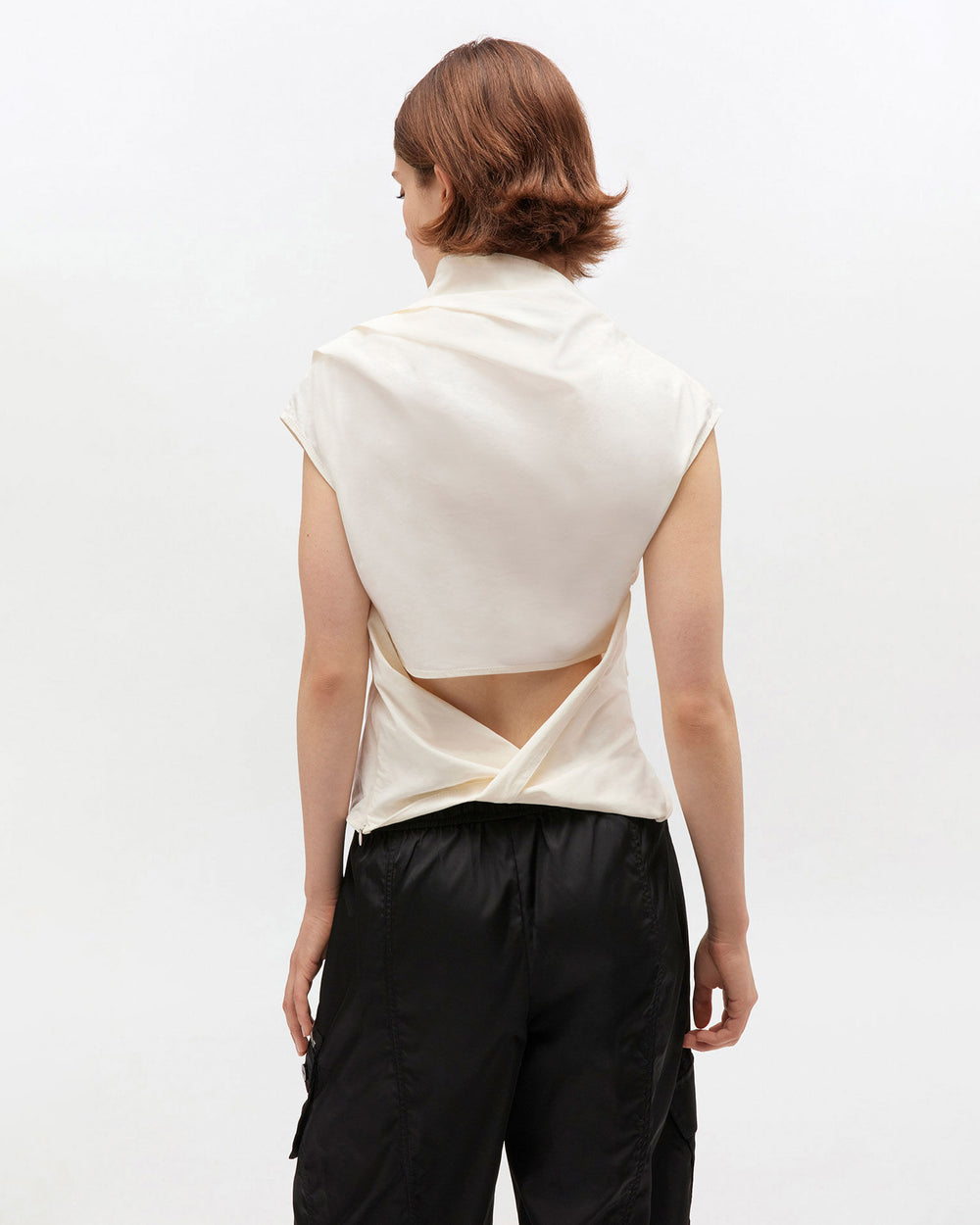 Slim fit top, cut from an organic cotton shirting. An asymmetrical silhouette, featuring a high neck, wide shoulder, opening at back and tucked, ruched detailing. Perfect as a work top or for summer parties.