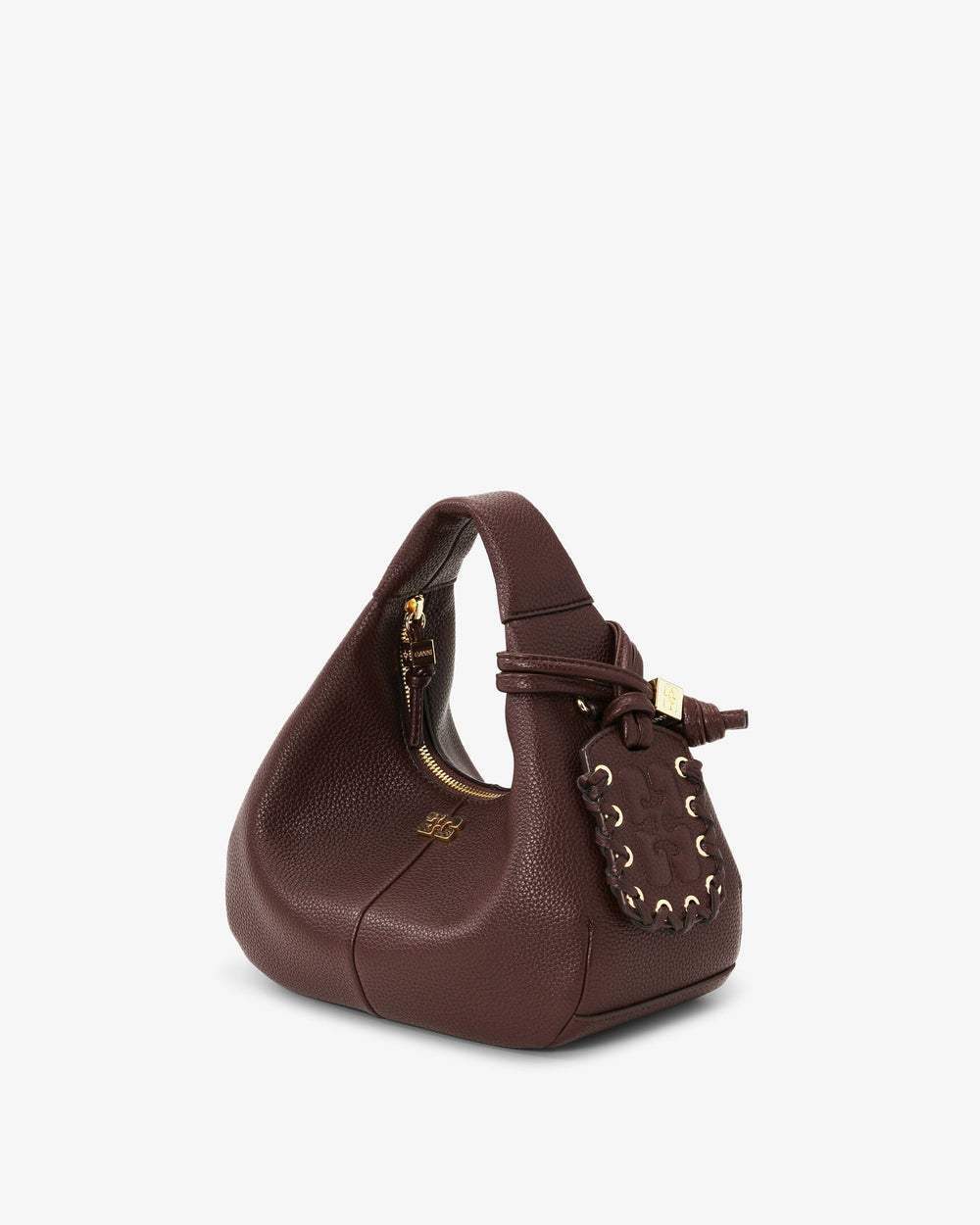 Small top-handle bag crafted from a grained recycled polyester. The Hobo Mini bag in colour chickory coffee features corseted lace-up details, sleek mirror charm for life on the go, and a supple finish for effortless transition over the shoulder or across the body. Ganni Hobo bags are designed to move with you through every moment.