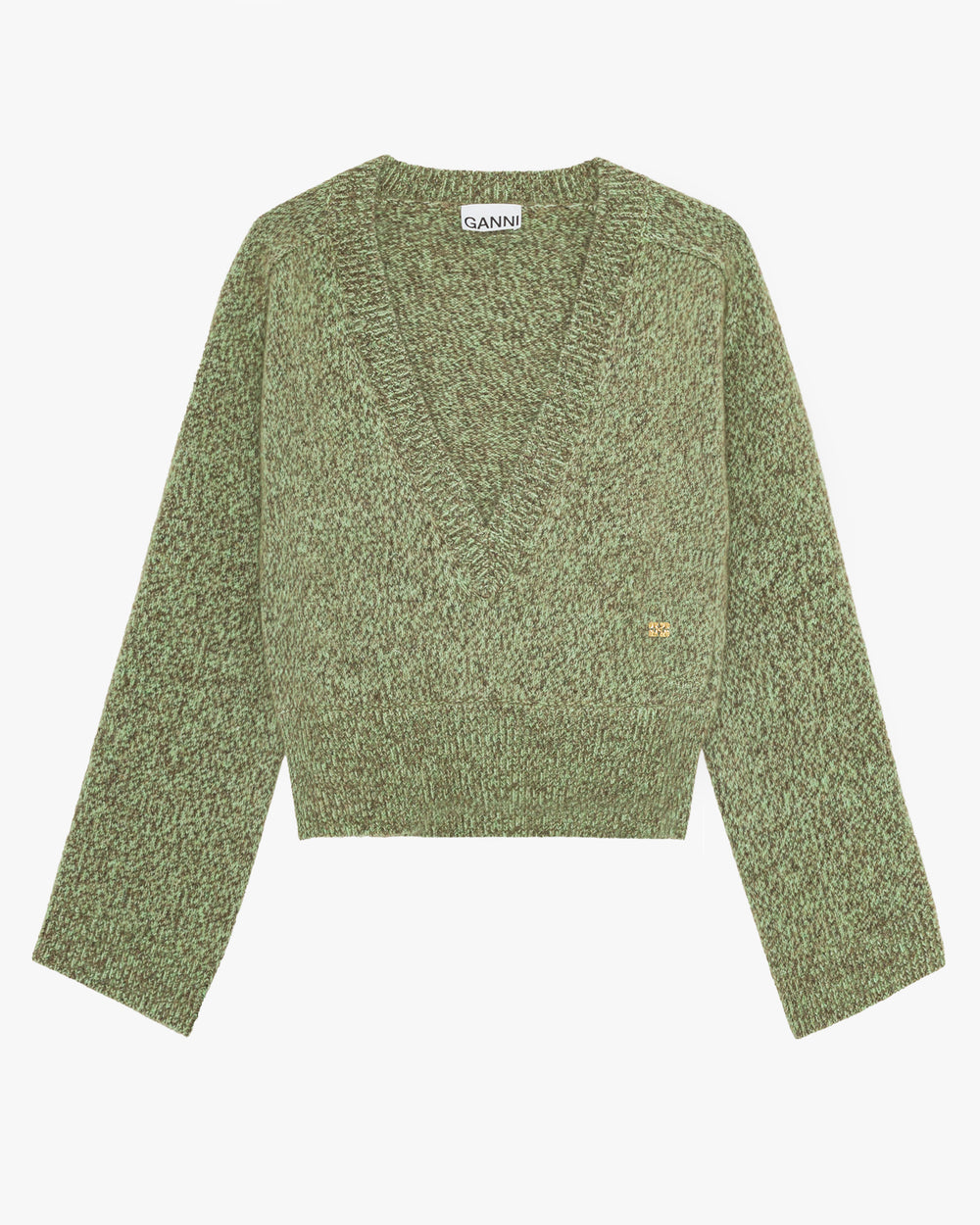 As seen on the GANNI Fall-Winter 25 runway, a relaxed fit sweater, knitted from a mohair mix blend. Featuring a deep V-neckline, cropped length, gold butterfly logo charm on side and mélange knit.