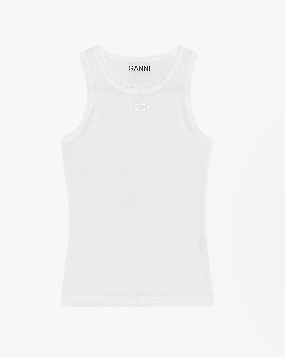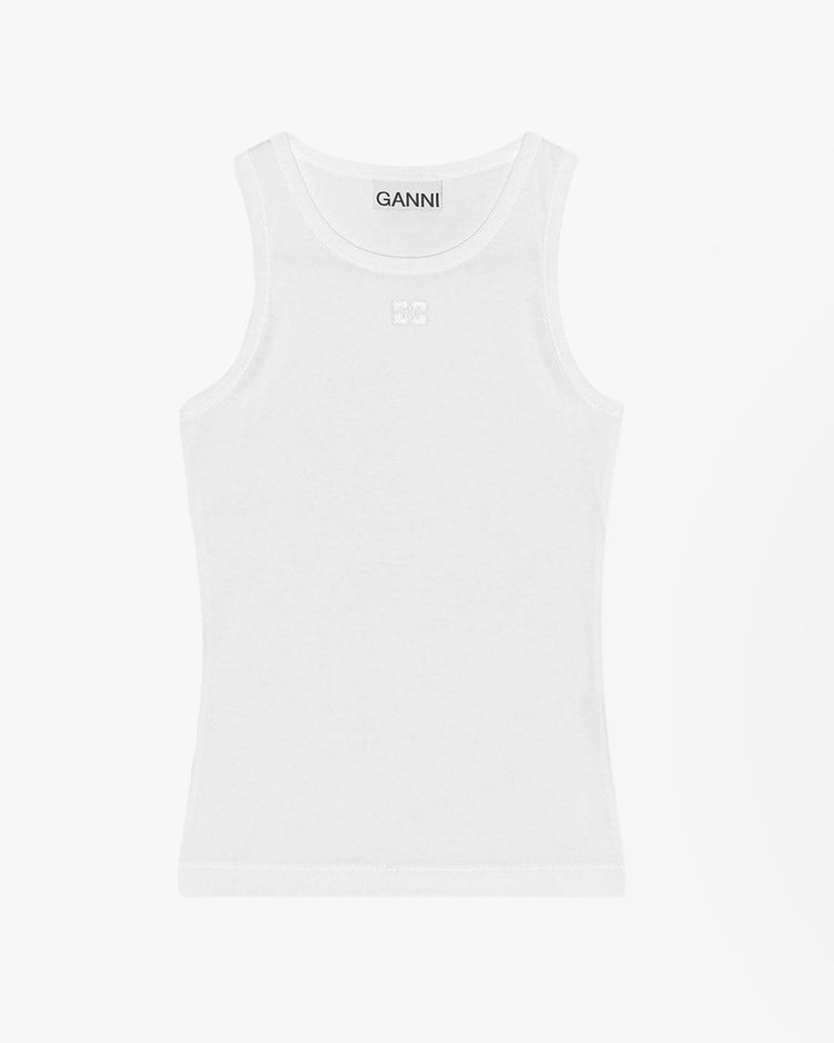 Slim fit tank top, cut from a Portuguese organic cotton. Featuring a round neckline, ribbed detailing and GANNI butterfly logo at front.