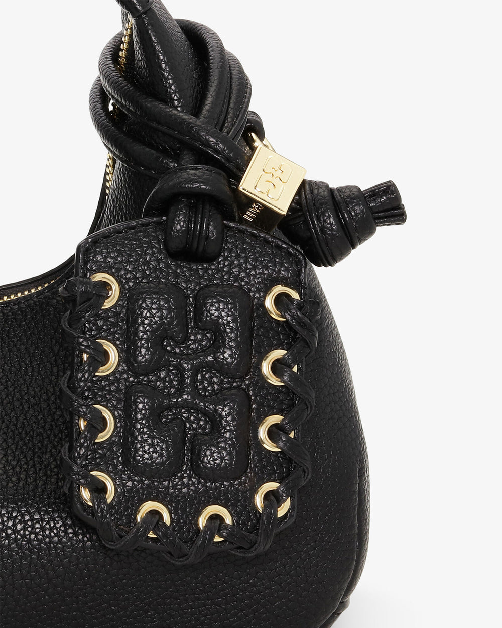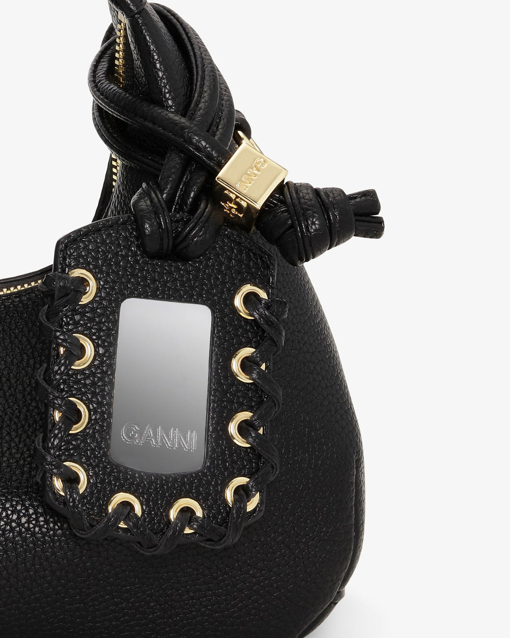 Small top-handle bag crafted from a grained recycled polyester. The Hobo Mini bag in black features corseted lace-up details, sleek mirror charm for life on the go, and a supple finish for effortless transition over the shoulder or across the body. Ganni Hobo bags are designed to move with you through every moment.