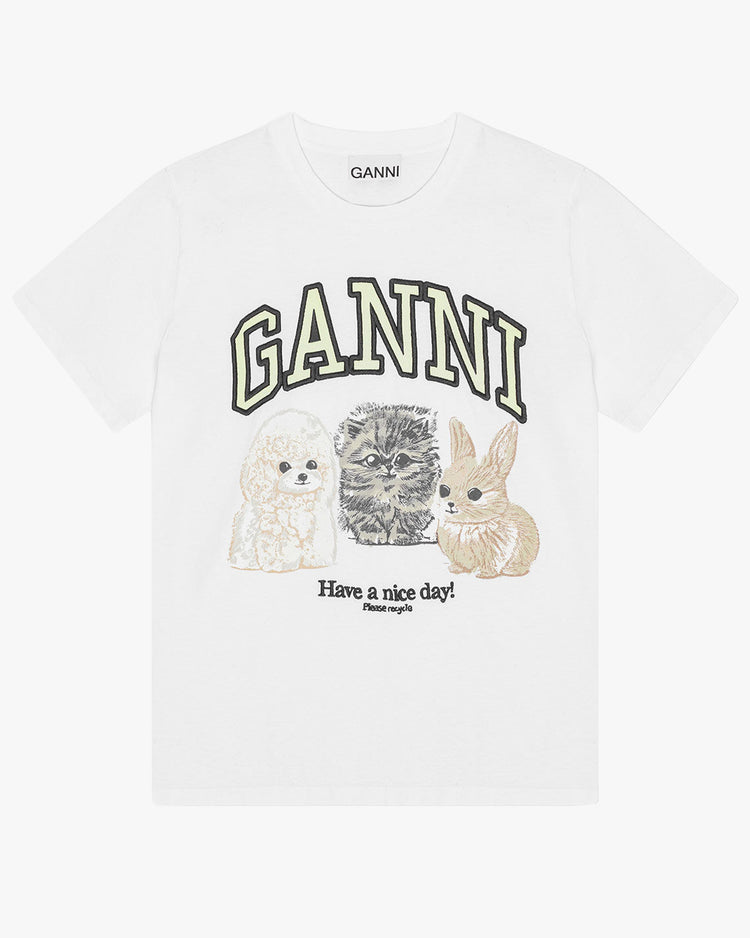 Relaxed fit t-shirt, cut from an organic cotton jersey. A boxy silhouette, featuring a crew neckline, short sleeves and embroidered Ganni logo, and graphic animals print on front.