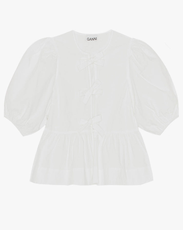Relaxed fit blouse, cut from a crisp organic cotton poplin. Featuring an open, round neckline, tie closures at front, peplum waist and voluminous puff sleeves. An iconic GANNI style.