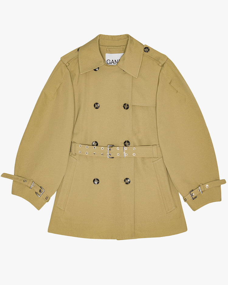 Relaxed fit trench coat, cut from a heavy twill. Double breasted, featuring a a two piece collar, epaulettes at shoulder, front button closure, voluminous puff sleeves with eyelet belt cuffs. An adjustable and removable belt at waist, two welt pockets at sides, oversized back storm shield, and a metal Ganni logo at chest.