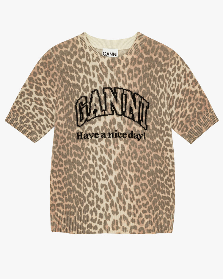 Classic t-shirt fit sweater, knitted from a leopard recycled wool blend. Featuring a crew neckline, short sleeves, ribbed neckline, cuffs and hem, and finished with a large Ganni logo graphic on the front & 'have a nice day' mantra.