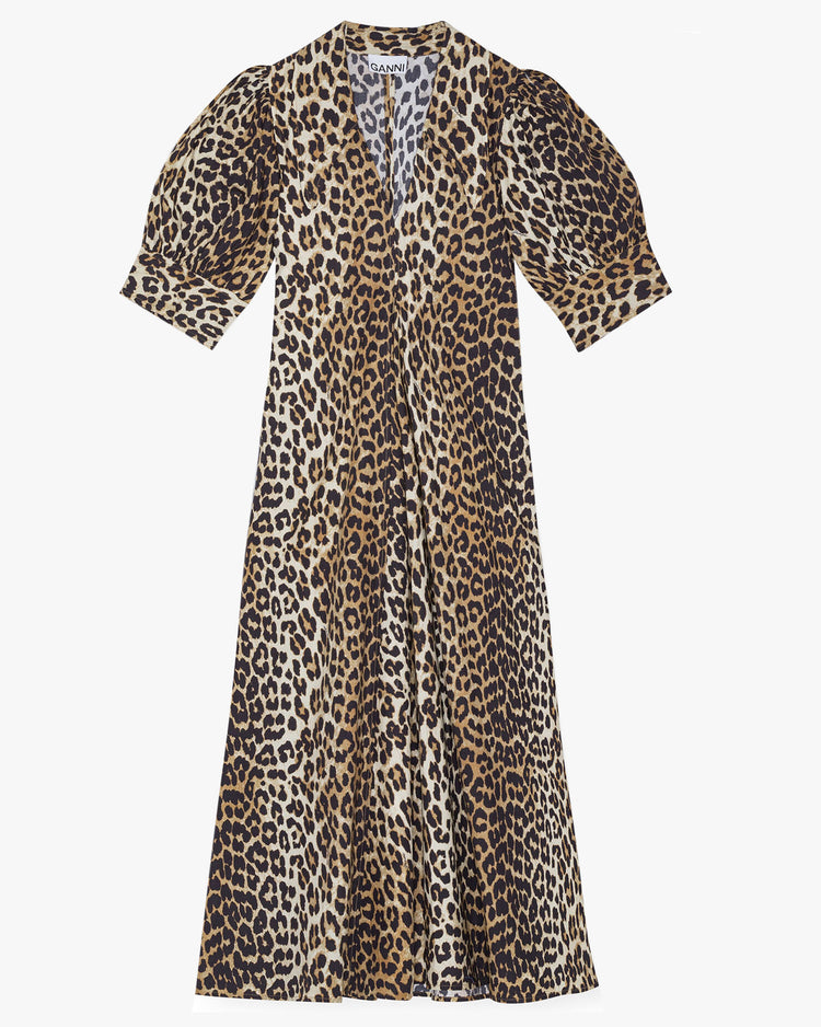 Relaxed fit midi dress, cut from a certified organic cotton poplin. Slim fitting through the bust, featuring a V-neckline, puff sleeves, with button cuff, side pockets and box pleat at front and back.