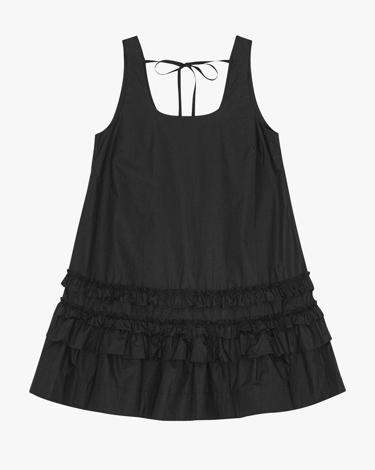Relaxed fit mini dress, cut an organic cotton poplin. An A-line silhouette, featuring a U-neckline, open back with adjustable back tie closure, no sleeves, drop waist and ruffle detailing at hem.