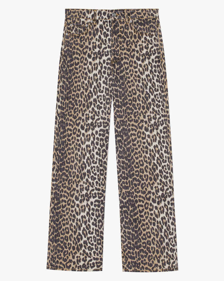 Relaxed fit jeans, cut from a leopard printed organic cotton denim. Mid rise, featuring a wide, leg, zip and button closure, Ganni logo buttons, classic 5 pocket denim detailing and Ganni logo patch at back.
