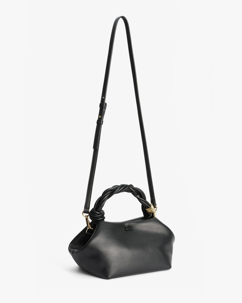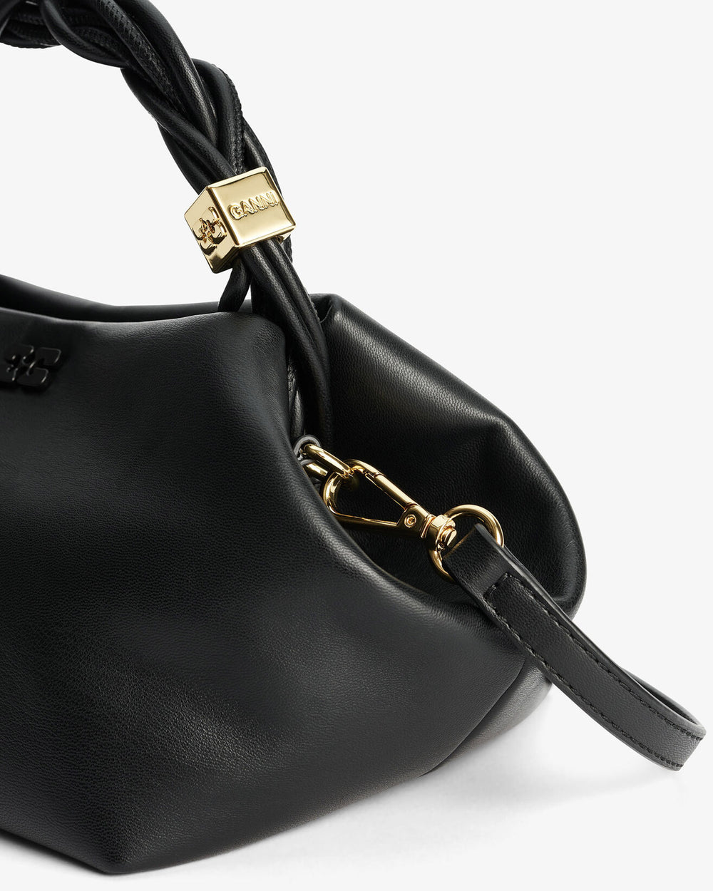 GANNI icon 'The Bou Bag' returns in burgundy. A hexagonal silhouette, featuring two compartments with magnetic closure, a braided top handle, removable strap for crossbody wear, and GANNI logo, and signature butterfly details throughout.