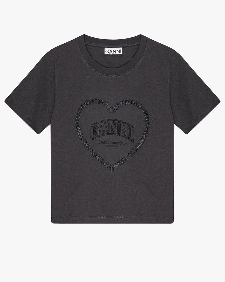Slim fit t-shirt, cut from a heavy weight organic cotton jersey. A baby tee silhouette, featuring a bound crew neckline, slight crop, short sleeves and large embroidered GANNI logo on front, with surrounded with a ribbon heart. 'Have a nice day'.