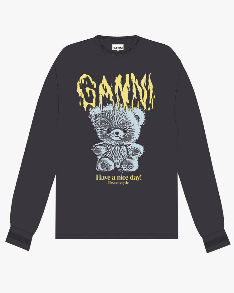 Relaxed fit long-sleeve t-shirt, cut from an organic cotton jersey. A boxy silhouette, featuring a crew neckline, long sleeves, ribbed cuffs and hem, embroidered Ganni logo, and graphic teddy print on front.