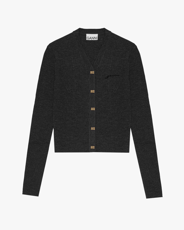 Slim fit cardigan, made from a ribbed merino knit. Featuring a deep v-neckline, front button closure with Ganni signature gold-toned butterfly buttons, long sleeves, ribbed cuffs and hem, and embroidered logo at chest.