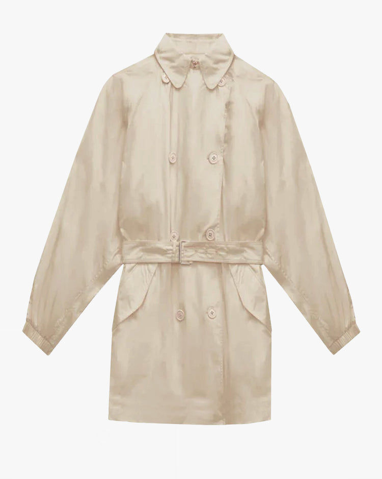 Relaxed fit short trench coat, cut from a cotton twill. Featuring trench style details, generous collar and lapel, dropped shoulders, double breasted front, belt tie at waist and elasticated cuffs.