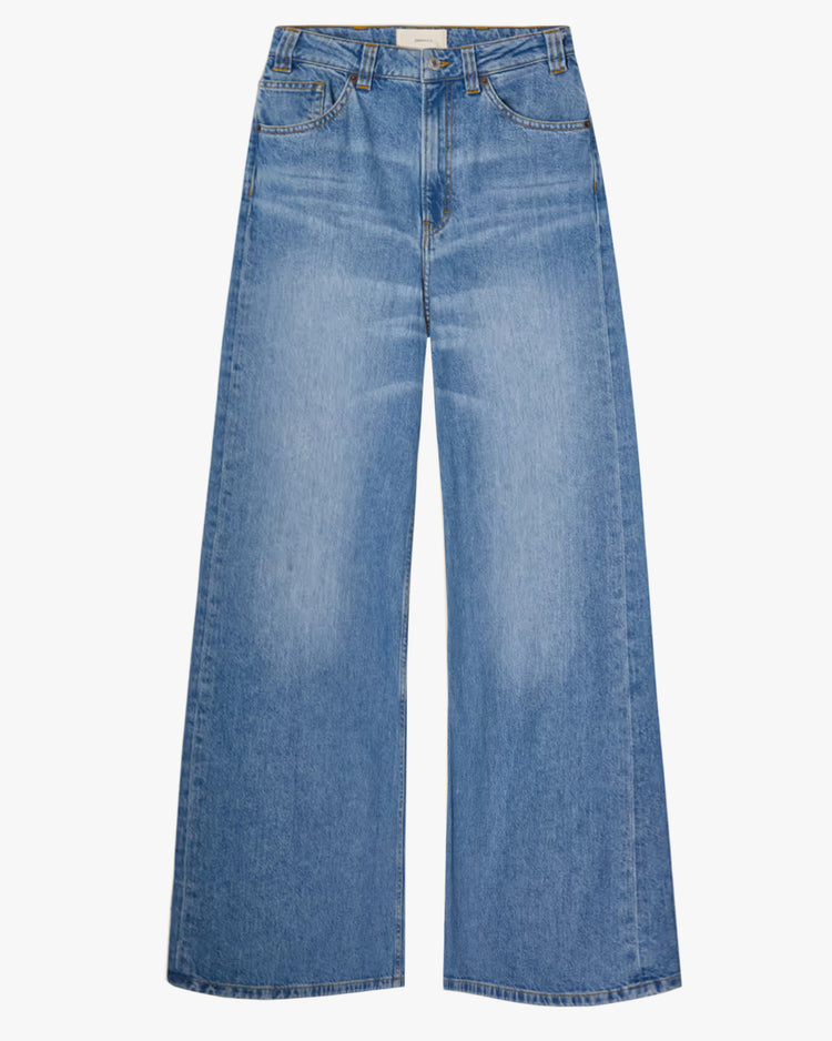 Relaxed fit jean, cut from a recycled cotton blend. A wide, flared silhouette, featuring a high rise, fitted top, 5-pocket style, zip fly and long length.