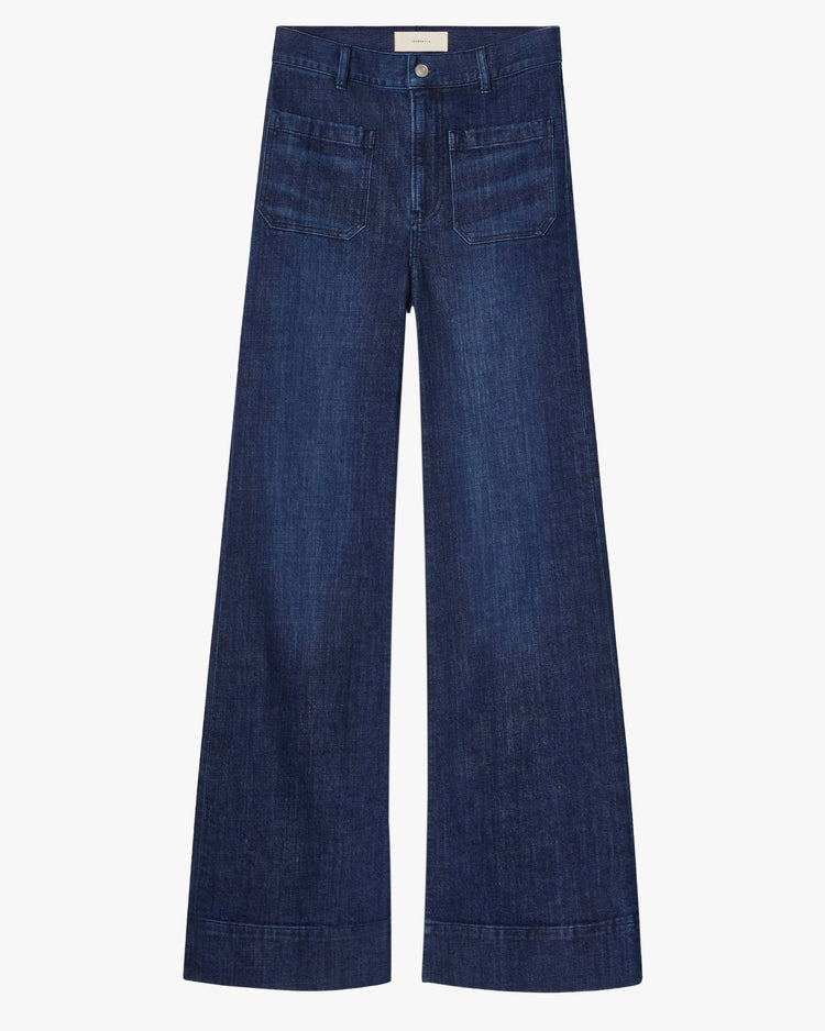 Slim fit jean, cut from a stretch cotton denim. Inspired by the Sailor jean of the 1960's, the St Monica features an ultra high waist, belt loops, zip fly, large patch pockets at hips, long flared leg, and a wide hemline.