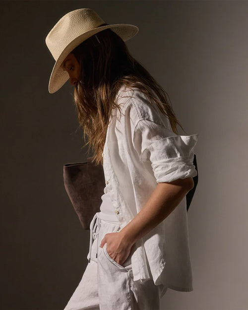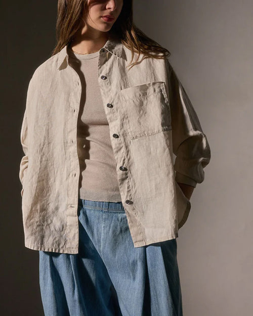 Relaxed fit shirt, cut from a lightweight linen. Featuring a two piece collar, front placket, button up front, patch pocket at chest, long sleeves and buttoned shirt cuffs.