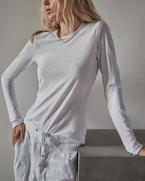 Slim fit t-shirt, cut from a cotton slub. Featuring a binded crew neckline, long sleeves, finished hems and a straight bottom hem. This style uses the reverse side of the fabric for added texture and is garment dyed with extra softeners for a soft, lived-in feel. Pair with the James Perse Women's Soft Drape Utility Pant in Driftwood for a relaxed summer look.