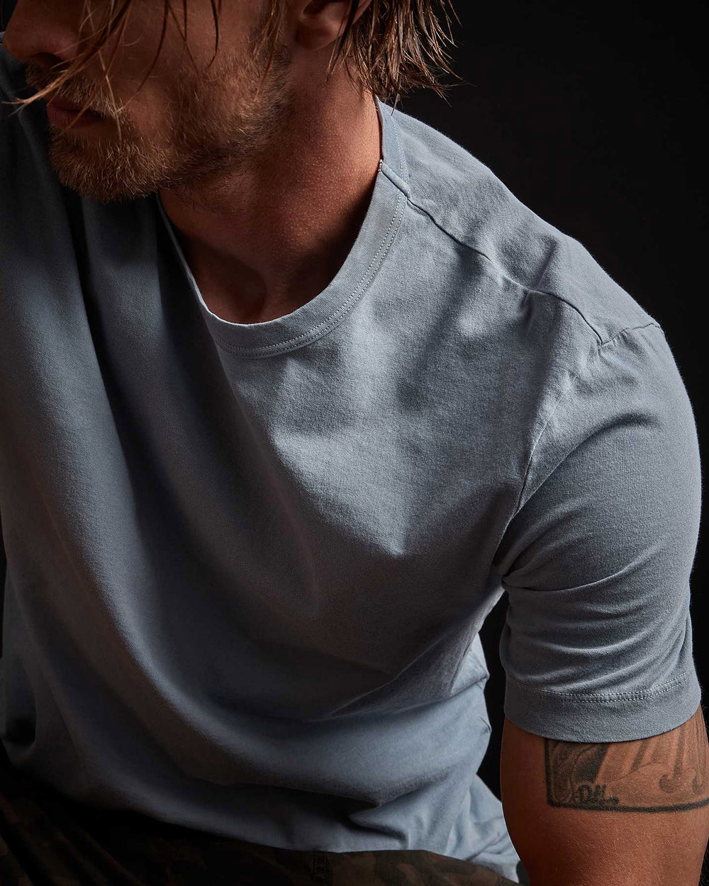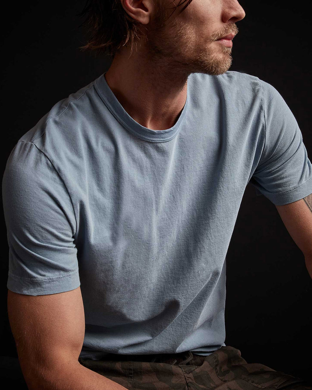 A James Perse icon - Classic fit t-shirt, cut from a soft lightweight jersey knit in colour Bluestone. Featuring a crew neckline, short sleeves and straight hem. A must-have wardrobe essential and core silhouette from James Perse, pair with Workshop Denim's Linen Drawstring Shorts, or your favourite pair of blue jeans this summer.