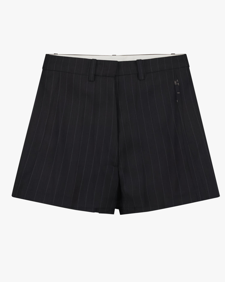 Tailored shorts, cut from a striped wool blend suiting. Low waisted, featuring a tailored waistband, belt loops, hook & loop fastening, back welt pocket, and a wide leg. Finished with LC silver toned logo.