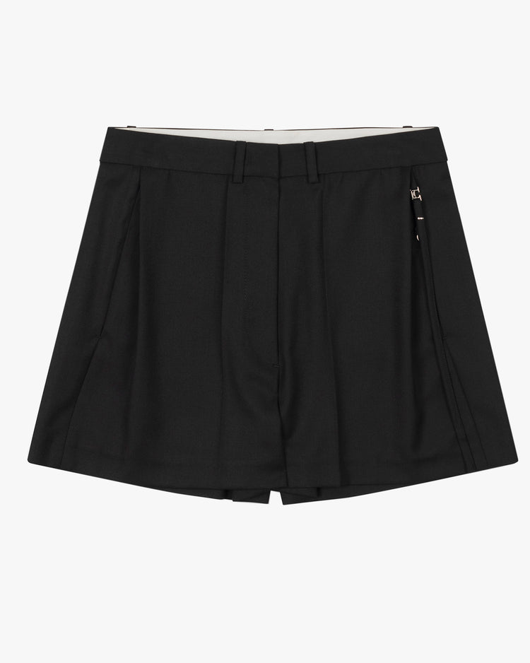 Tailored shorts, cut from a wool blend suiting. Low waisted, featuring a tailored waistband, belt loops, hook & loop fastening, back welt pocket, and a wide leg. Finished with LC silver toned logo.