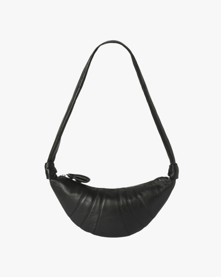 Crossbody style bag, crafted from a soft nappa leather. Inspired by the shape of a croissant, featuring a metal zipper, side knot finishing and puffy leather pull tab. The Lemaire Croissant Bag will soften over time, allowing each bag to mold to its wearer.
