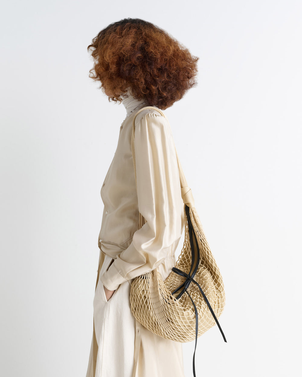 An interpretation of the iconic croissant bag - a crossbody style bag, crafted from a netted fabric, with soft nappa leather elements. A croissant silhouette, featuring a removable FILT net exterior, internal nylon main compartment, nappa leather drawstring, knot details, and snap closure. A collaboration between Lemaire and heritage company FILT.