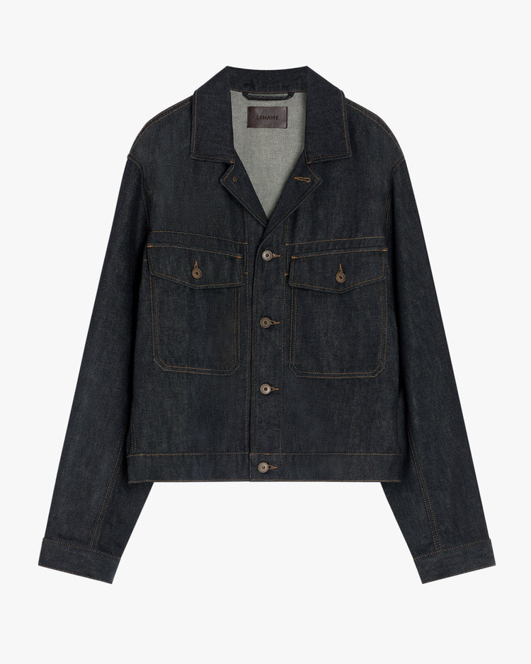 This trucker jacket is an emblematic piece in Lemaire's workwear wardrobe. A relaxed fit, crafted from a thick, yarn-dyed slate denim with a raw hand, adding a sophisticated touch. A boxy silhouette, featuring a shirt collar, buttoned front and adjustable tabs at waistband. Pair with the matching Lemaire Maxi Barrel Workwear Pants.