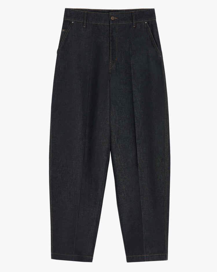 These oversized barrel-cut pants reflect Lemaire's love for workwear and reinterpretation of archetypal pieces. Oversized fit, cut from a glossy coated denim developing a patina over time. Featuring a barrel leg, distinct front and back pleats, and ornamental detailing. Wear as a suit with the with the Lemaire Trucker Jacket.