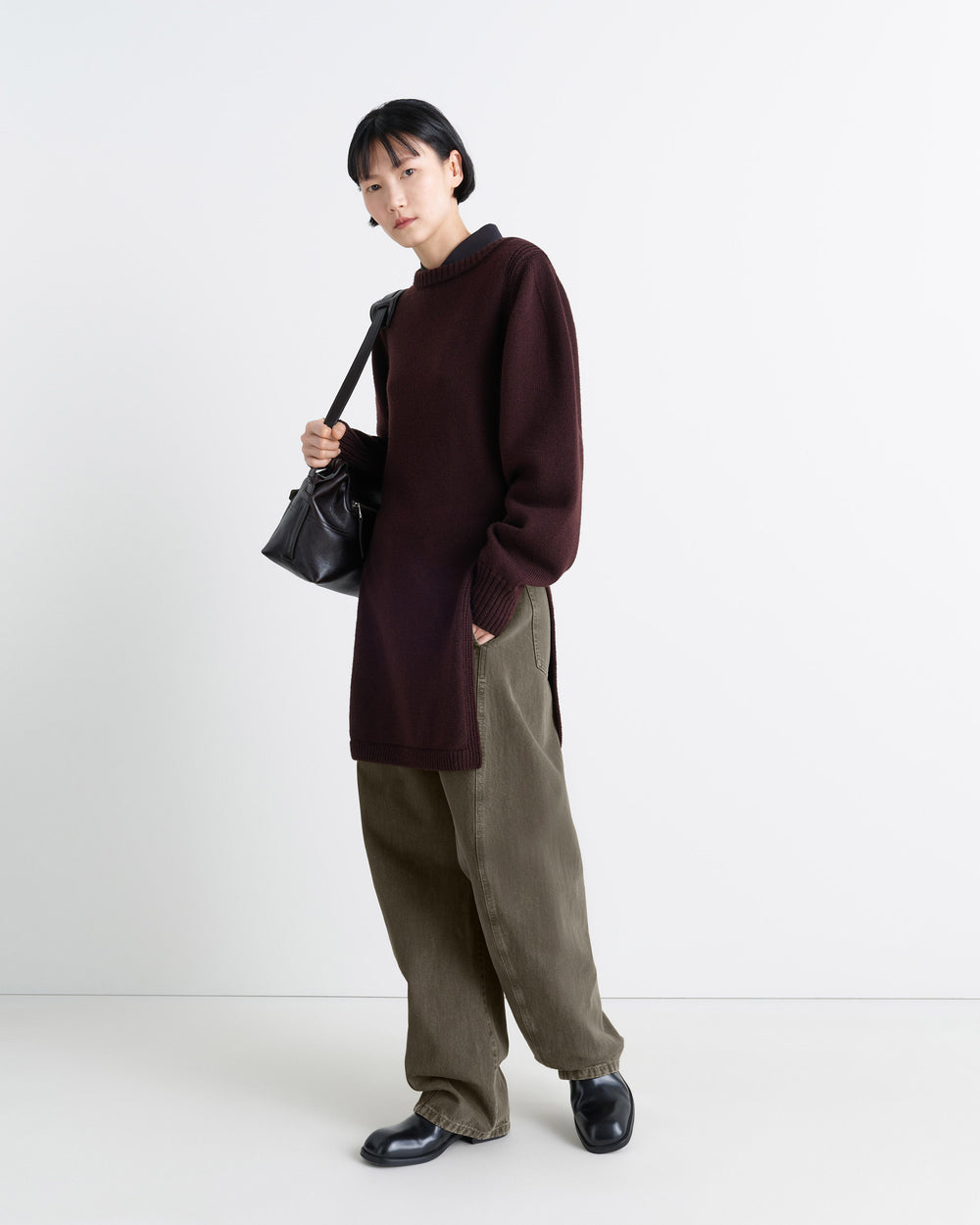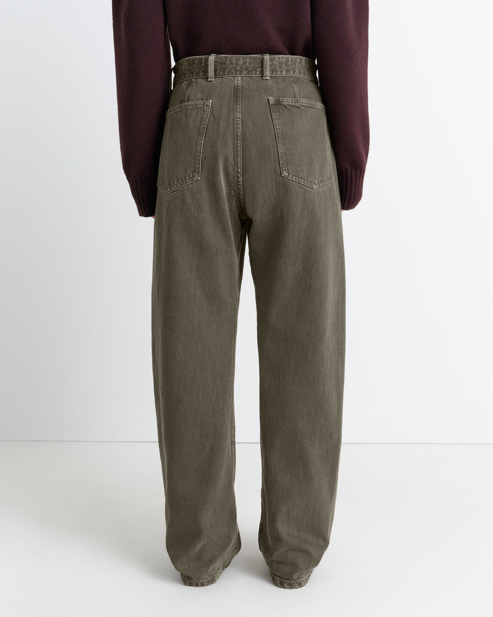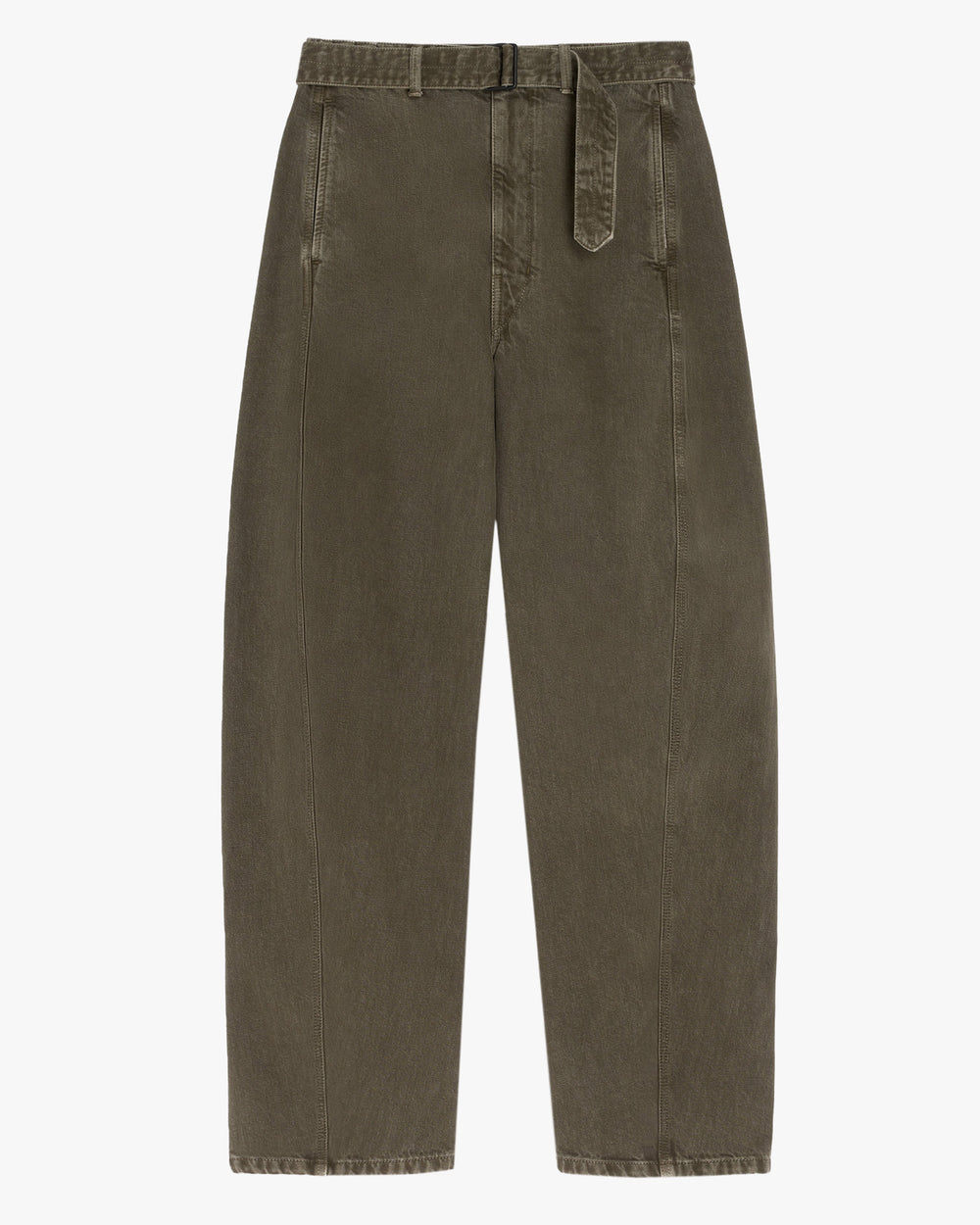 Relaxed fit pants, cut from a heavy-weight cotton denim that has been garment-dyed to give them a snowy patina. High rise, featuring a curved leg with twisted side seams, removeable matching belt, side seam pockets, patch pockets at back and finished with tonal top-stitching.