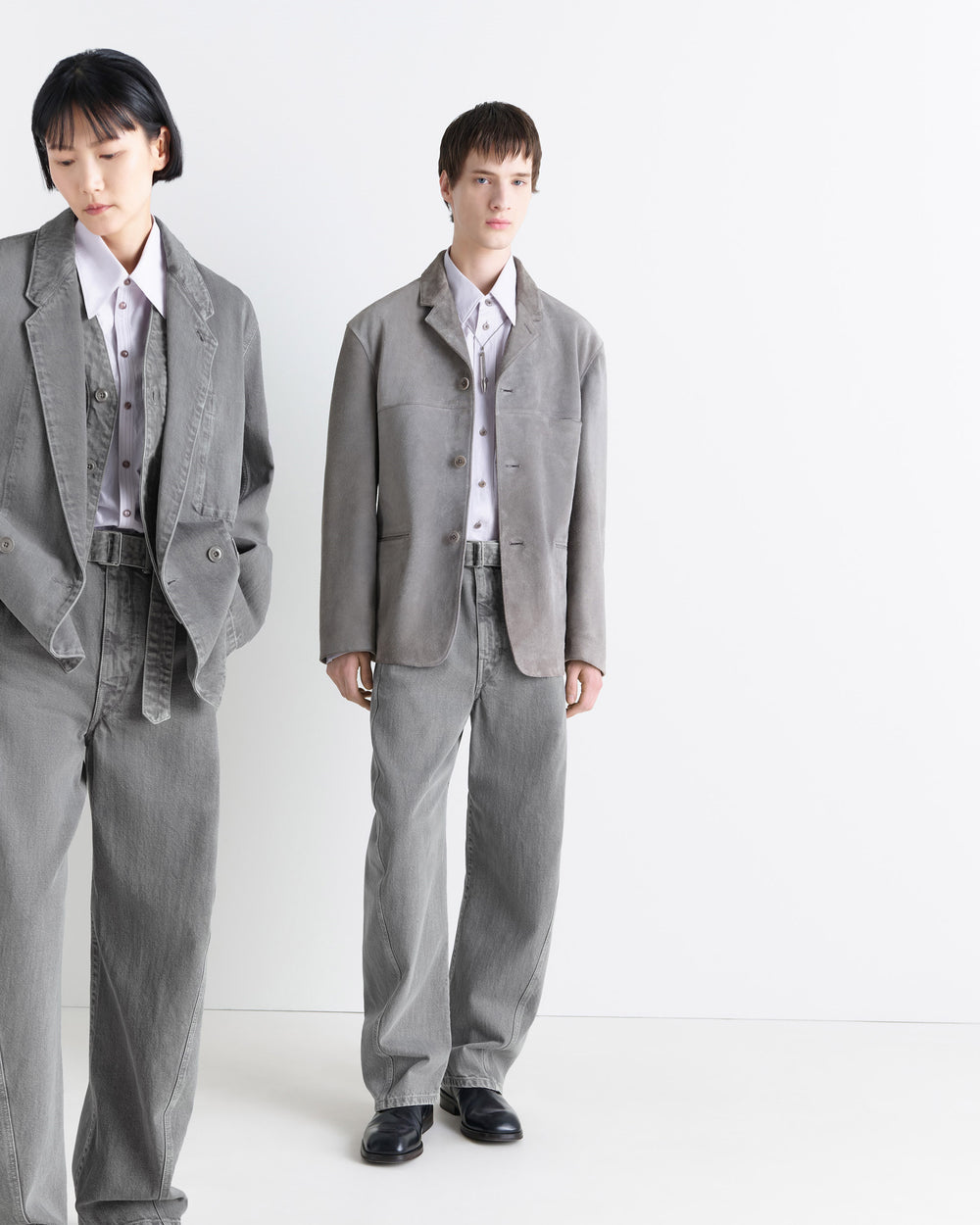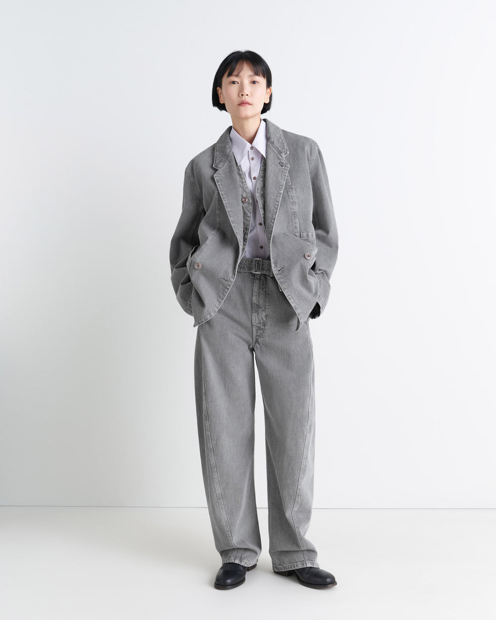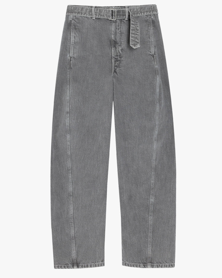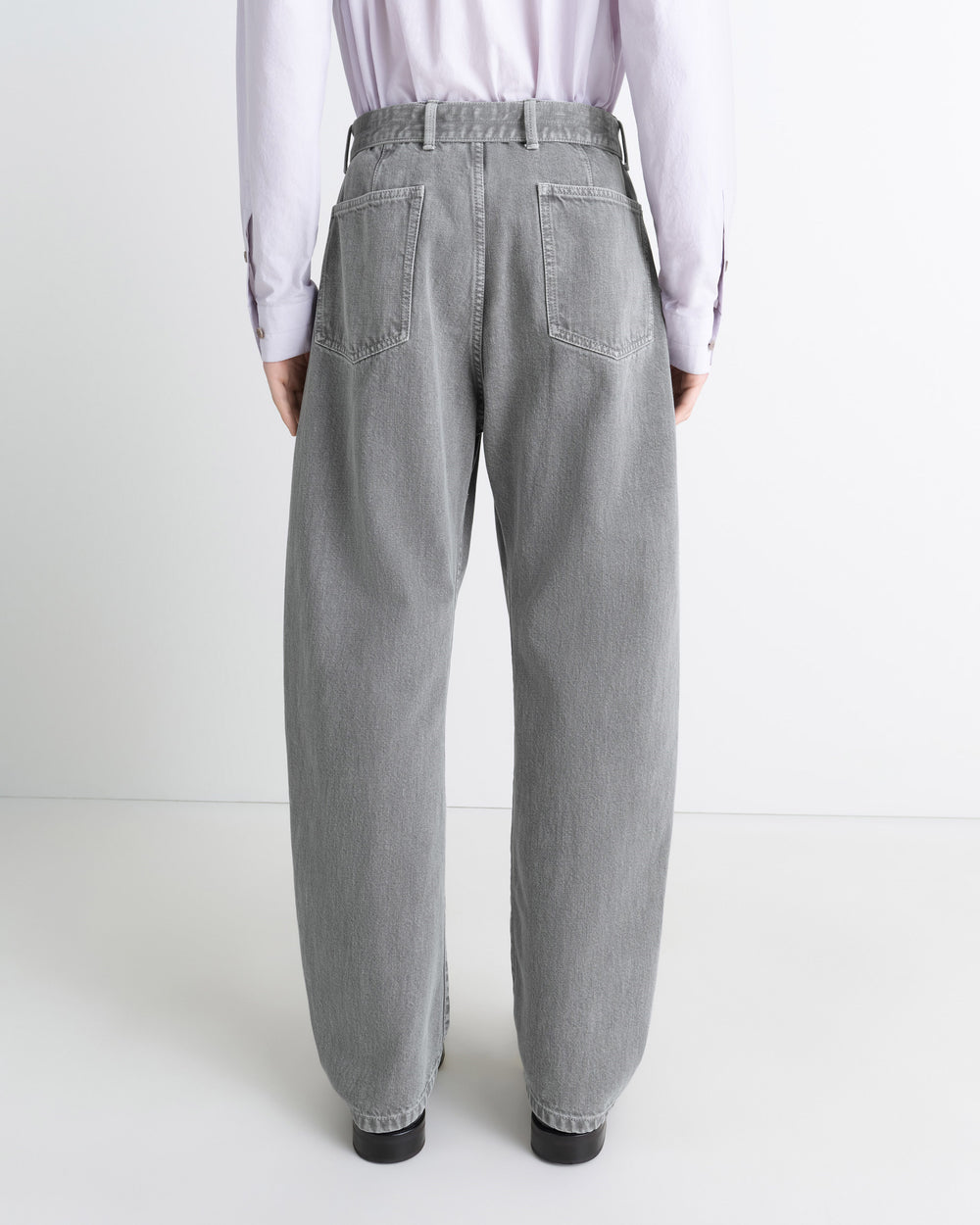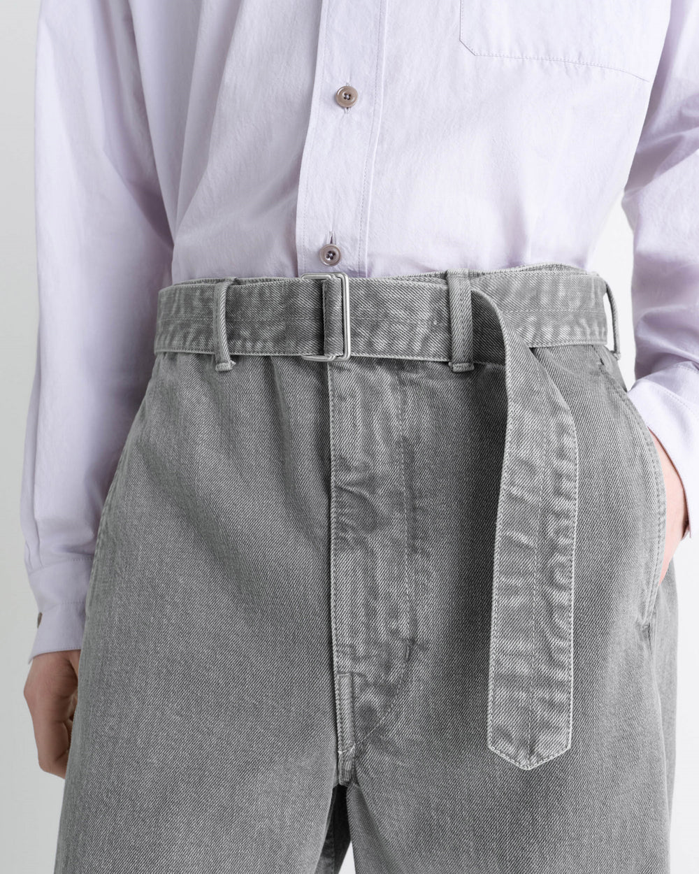 Relaxed fit pants, cut from a heavy-weight cotton denim that has been garment-dyed to give them a snowy patina. High rise, featuring a curved leg with twisted side seams, removeable matching belt, side seam pockets, patch pockets at back and finished with tonal top-stitching.