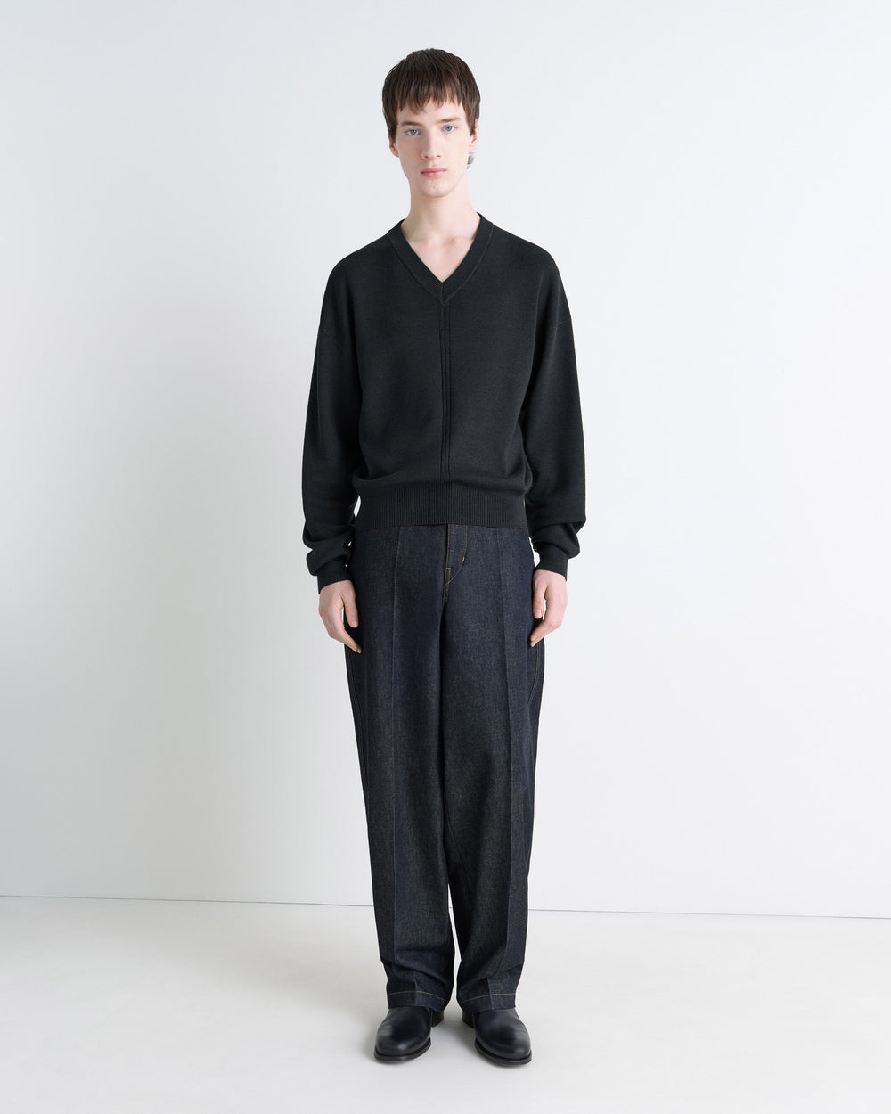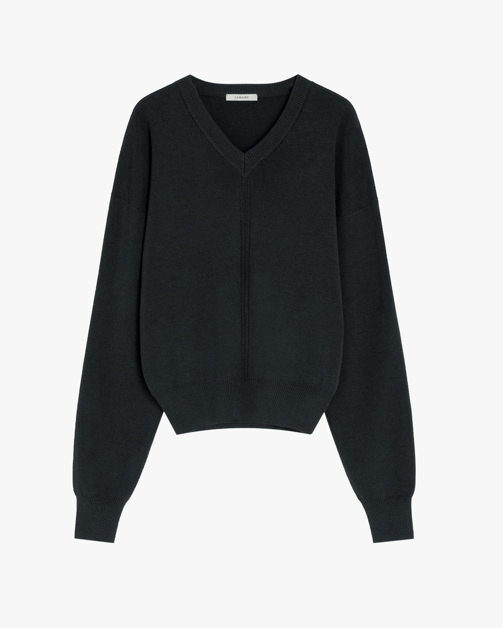A Lemaire wardrobe staple. Straight cut v-neck sweater, knitted from a merino wool blend that is both dry and soft. Featuring a V neckline, centre seam detailing, long sleeves and a rib-knit trim.
