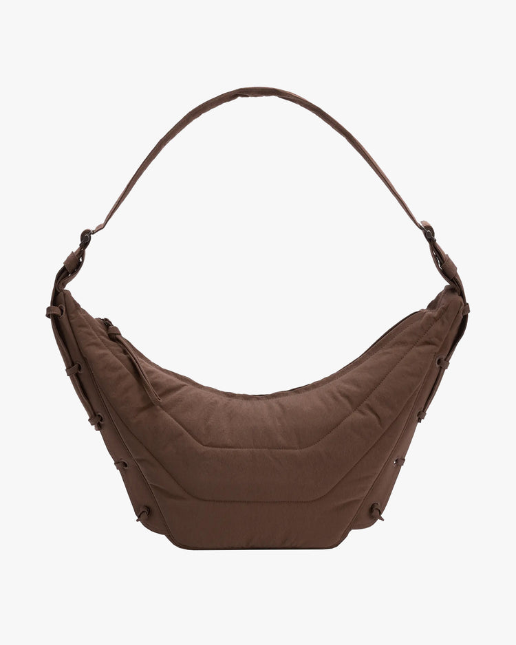 Crossbody style unisex bag, crafted from a water-repellent nylon canvas. Inspired by Lemaire's classic Croissant Bag, this is a sturdy structure that holds its shape over time. Featuring a main zip compartment, internal zip pocket, adjustable strap with metal buckle, and embroidered eyelets with self-fabric laces allowing the shape to be adjusted.