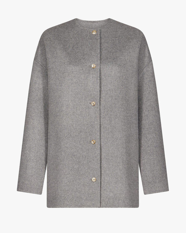 Relaxed fit coat, cut from a soft wool-cashmere. Single breasted, featuring a round neckline, dropped shoulders, front button closure, and side slash pockets.