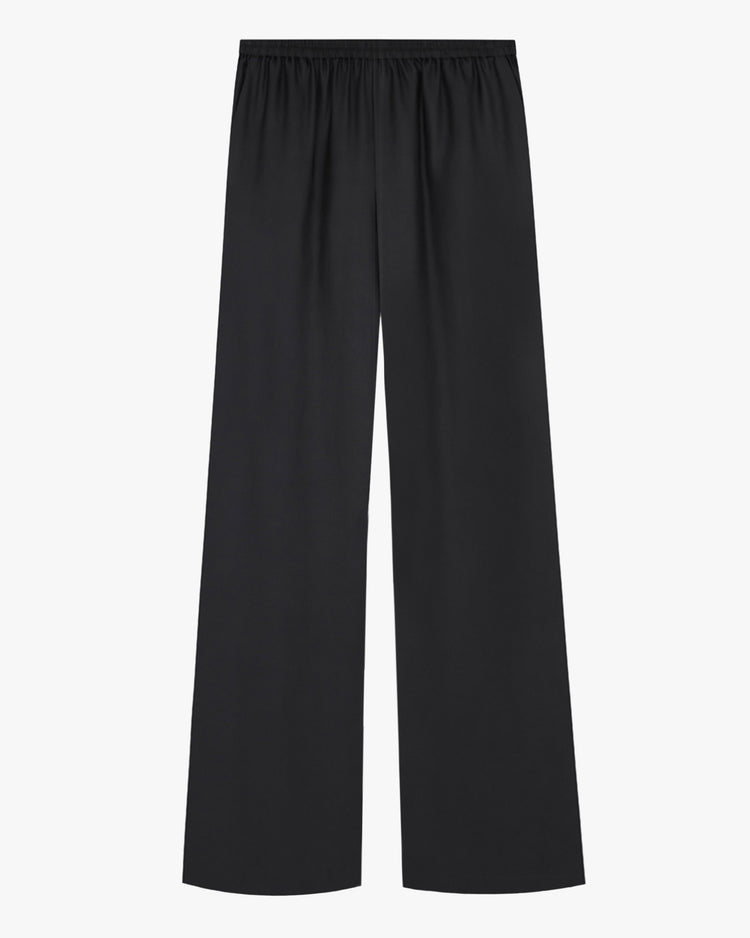 Relaxed fit trousers, cut from a silk twill. High waisted, featuring a wide leg, an elasticated waistband, side slant pockets, and a rear patch pocket.