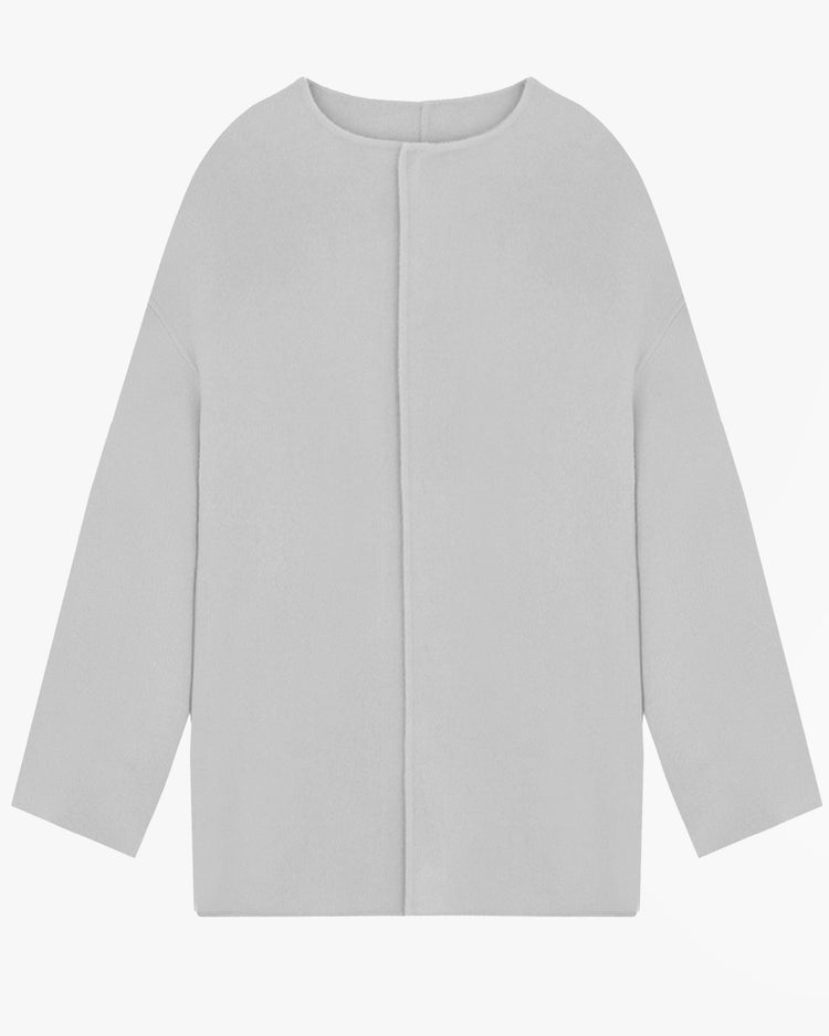 Relaxed fit coat, cut from a soft wool-cashmere. A boxy silhouette, featuring a round neckline, no collar, dropped shoulders, concealed front button closure, and side slash pockets. The Gio is set to become your new favourite coat.