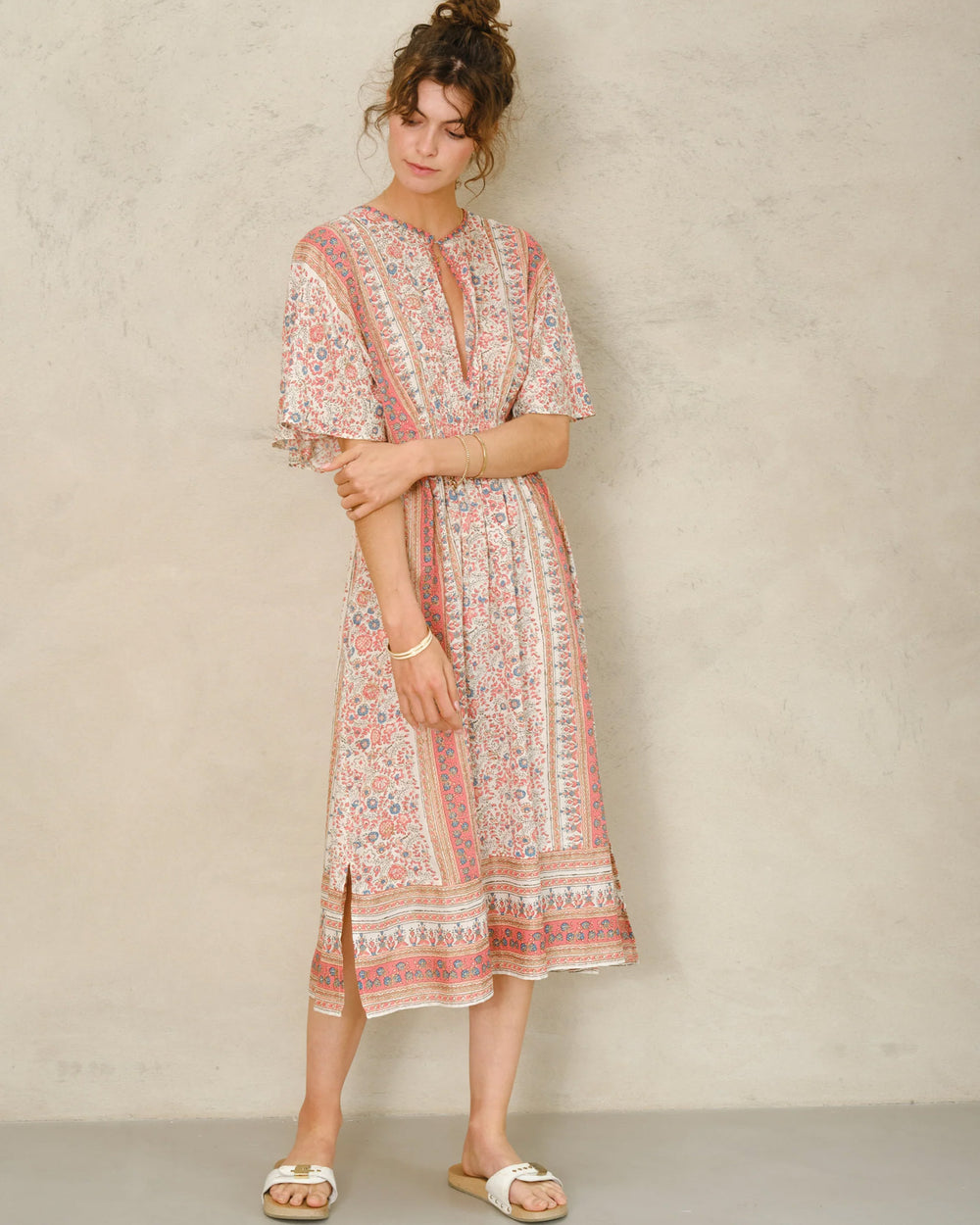 Relaxed fit throw on dress, cut from a vintage look floral print. A midi silhouette featuring a deep v-neckline, short sleeves, gathered, elasticated waist and gathers through body.
