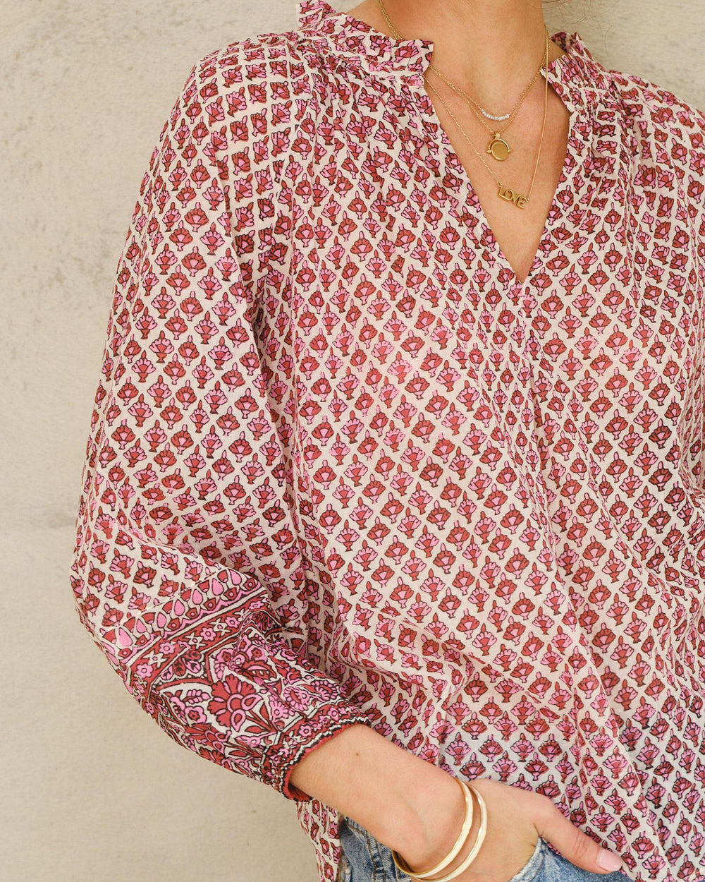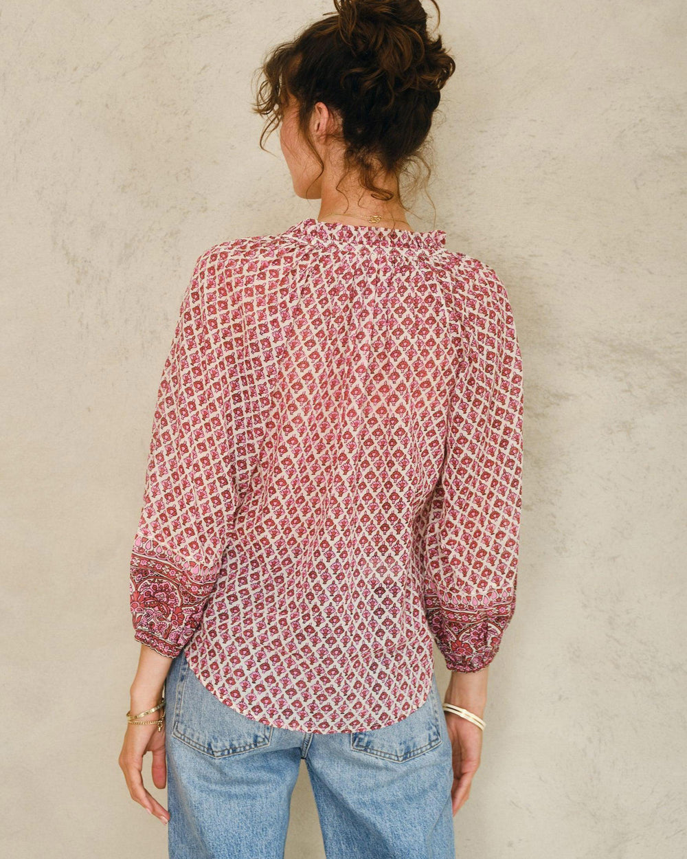 Relaxed fit blouse, cut from a lightweight printed cotton voile. Featuring a band collar, deep V-neckline, long sleeves, contrasting cuffs and hem and delicate gathers at shoulder and across back.
