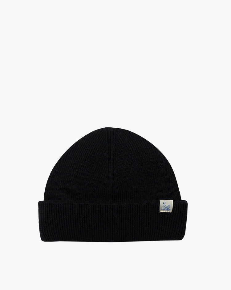 Classic fit beanie, knitted from a soft ribbed Merino Wool. Featuring a ribbed turnover, and Merz B. Schwanen swan loop logo label.