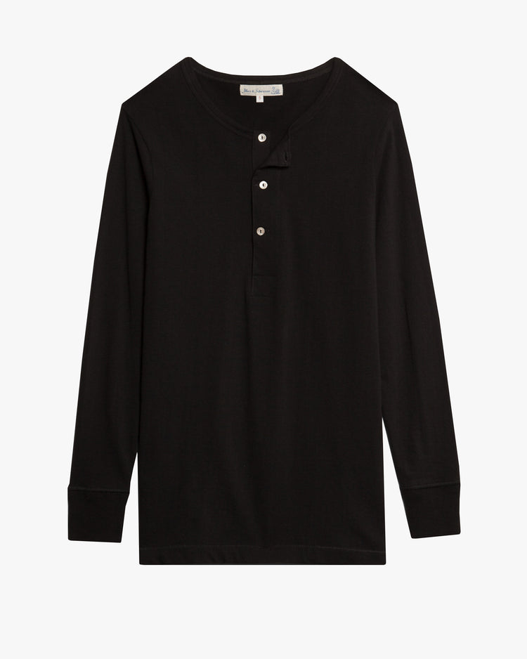Classic fit L/S Tee, crafted on a loopwheel from from a heavyweight Organic Cotton. A Featuring a classic crew neckline, Henley style three button closure from neck, mother of pearl buttons, seamless body, long sleeves, ribbed cuffs and a straight hem. Constructed on an original loop wheelers / circular knitting machine creating a fabric with no tension, twisting or loosing shape. Sizing up is recommended for the classic fit styles.