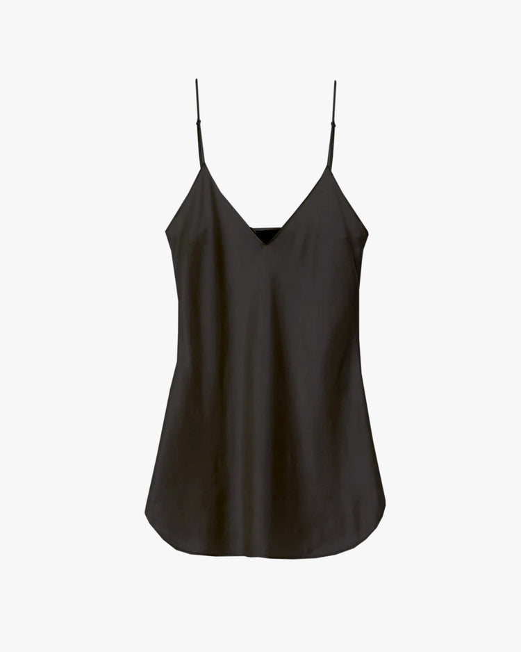 Slim fit camisole, cut from 100% silk. Featuring a V-neckline, adjustable spaghetti straps, and a curved hem.