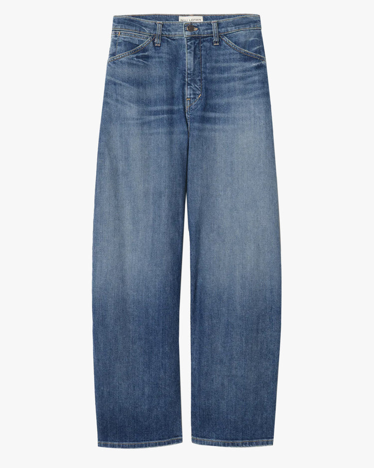 Relaxed fit jean, cut from a washed, stretch denim. Mid rise, featuring a barrel leg, belt loops on waistband, hook and button closure, concealed zip fly, slant pockets at front, patch pockets at back and a coin pocket. Inspired by the Iconic Shon pant.