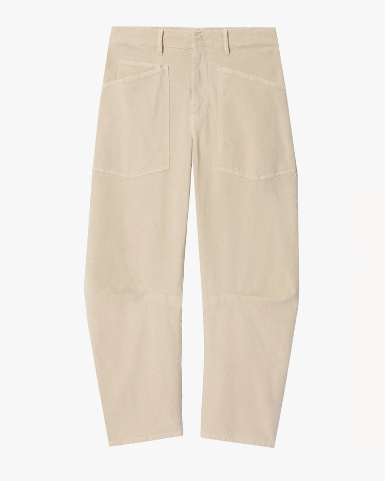 Relaxed fit pant, cut from an Italian stretch cotton corduroy. A unique curved leg silhouette achieved by strategically placed pleats at the inner knee, and oversized patch pockets at front and back.