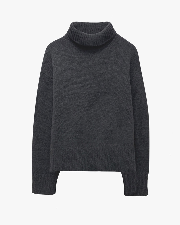 Heavyweight, oversized boxy funnel neck sweater knitted from Italian lambswool. The Omaira sweater features a high neck designed to be worn up, but easily able to fold over, dropped shoulder and ribbing along neck, sleeve and hem. Fully fashioned along arm hole and shoulder.