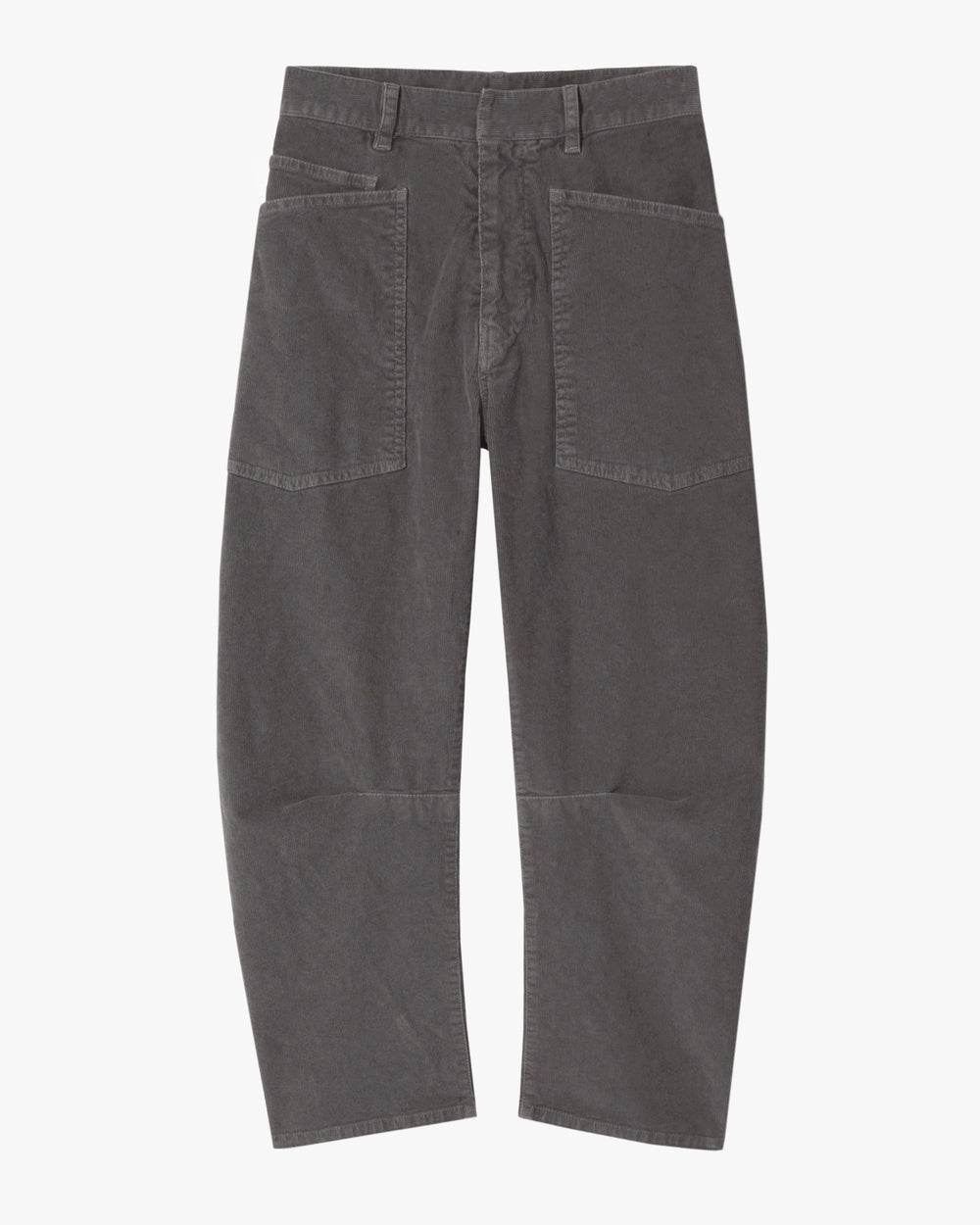 A Nili Lotan icon. The 'Shon Pant' is a relaxed barrel fit, cut from an Italian stretch cotton corduroy. A unique curved leg silhouette achieved by strategically placed pleats at the inner knee, and oversized patch pockets at front and back.