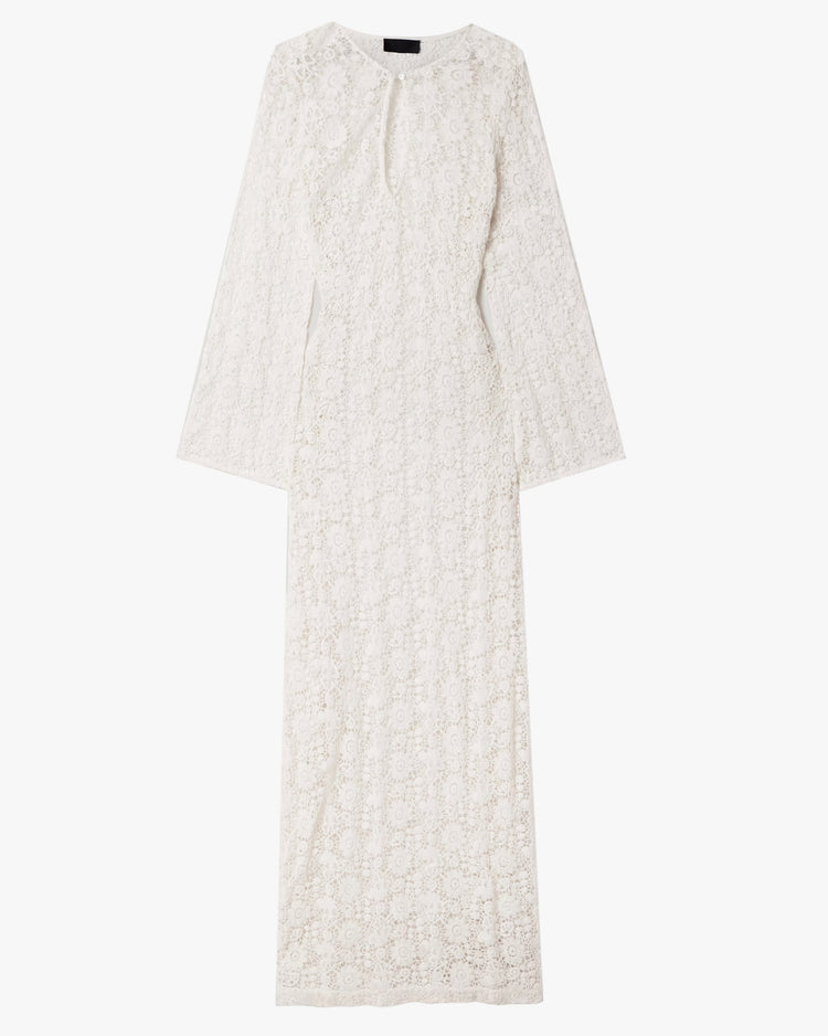 Relaxed fit maxi dress, made from an Indian Cotton Lace. The Della dress is a long silhouette, featuring a deep v-neckline with optional keyhole button closure, dropped shoulders, long flared sleeves, and side slits. Perfect for layering over swimwear all summer long.